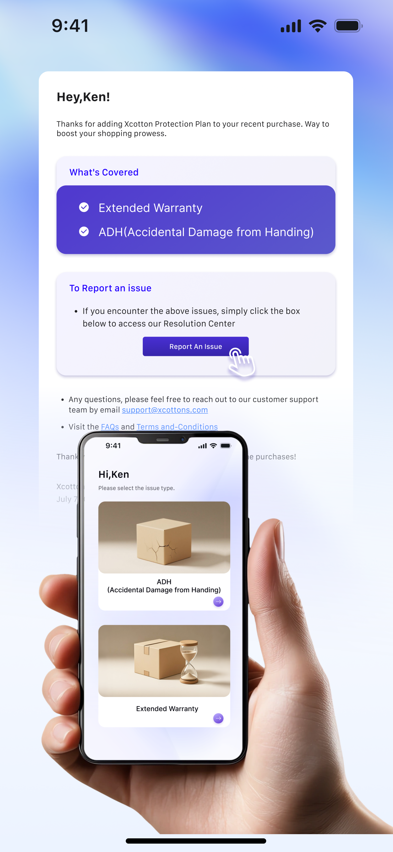 b. Email confirmation: After purchasing, consumers will receive an email titled “XCOTTON PRODUCT PROTECTION PLAN PURCHASE CONFIRMATION” → Click the highlighted link to access the Claims Center.